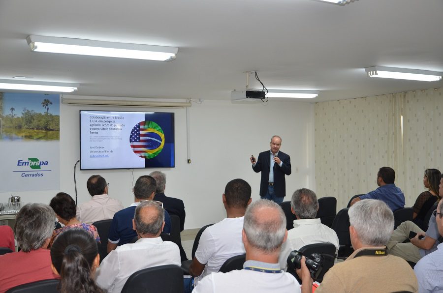 Professor de forragicultura e pastagens da Universidade da Flórida há 10 anos, o pernambucano José Carlos Dubeux é reconhecido internacionalmente como uma autoridade em eficiência no uso de nutrientes em sistemas agrícolas, com ênfase na mitigação e adaptação às mudanças climáticas, emissões de metano da pecuária e sistemas de Integração Lavoura-Pecuária. Acompanhado pelo conselheiro agrícola da Embaixada dos Estados Unidos (EUA) em Brasília, Michael Conlon, ele visitou a Embrapa Cerrados (DF) na última quarta-feira (20), quando apresentou a palestra “Colaboração entre Brasil e EUA em pesquisa agrícola: lições do passado e construindo o futuro à frente”. Dubeux divulgou a iniciativa Fertilize 4 Life, uma parceria entre a Embrapa e instituições de pesquisa agrícola norte-americanas, e compartilhou experiências de pesquisas desenvolvidas na Flórida.