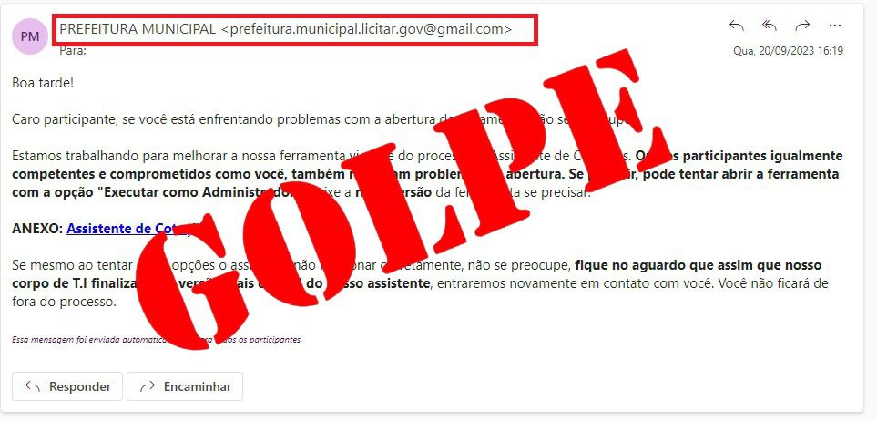 E-mails alegam ser do Departamento de Licitação, pedindo para baixar uma ferramenta intitulada “Assistente de Cotação”, município alerta para usuários desconsiderarem e-mails que não possuem o final @maracaju.ms.gov.br