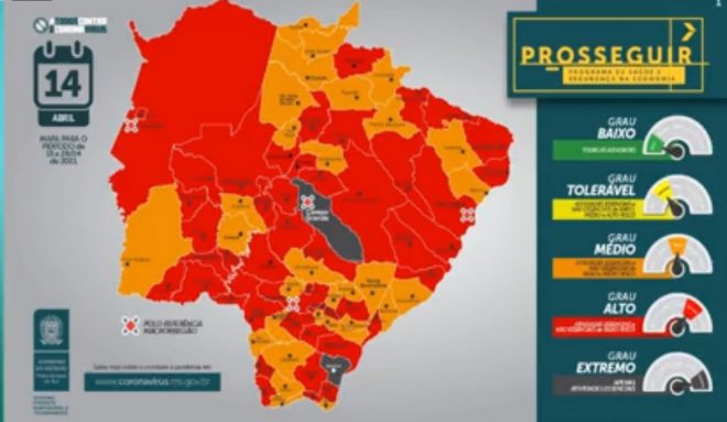 Campo Grande entrou na bandeira cinza para risco de contágio do coronavírus, conforme atualização do Programa Prosseguir desta quarta-feira (14). Com a nova classificação, o Estado recomenda toque de recolher a partir das 20 horas.
