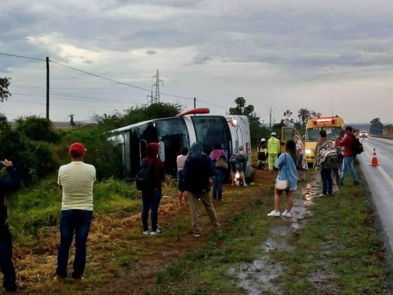 A informação é de que o ônibus saiu da pista e em seguida tombou.