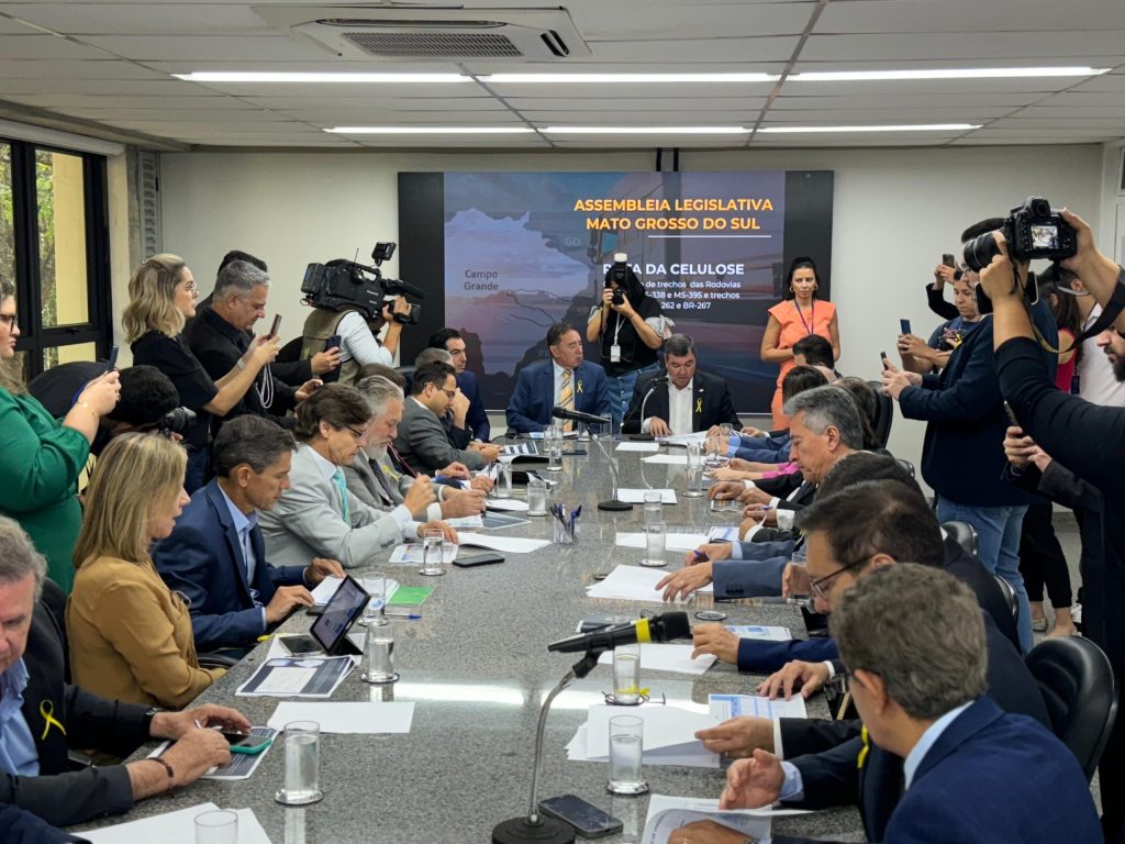 Durante a reunião o governador Eduardo Riedel apresentou aos parlamentares o projeto “Rota da Celulose”, que prevê a concessão de trechos das rodovias BR-262, BR-267, MS-040, MS-338 e MS-395.