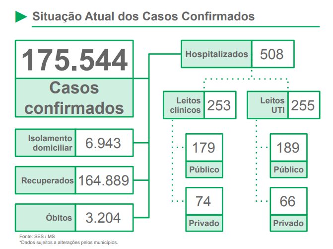 O número de óbitos diminuiu e pela primeira vez a capital não registrou nenhuma morte de paciente. As cidades que tiveram perdas foram Paranaíba (2), Três Lagoas, Sidrolândia, Corumbá, Aquidauana.