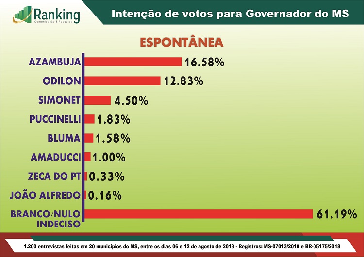Dois nomes que não fazem parte do quadro atual de candidaturas ao Governo foram citados pelos eleitores: o ex-governador emedebista André Puccinelli (1,83%) e o deputado federal Zeca do PT (0,33%). Destaca-se o grande número de pessoas que disseram estar indecisas e as que pretendem votar em branco ou anular o voto: 61,19%.
