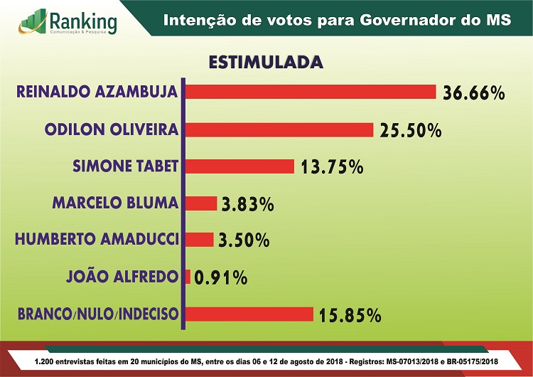 Nos dois cenários da consulta de intenção de voto feita pela Ranking, Azambuja e o candidato do PDT, o juiz federal aposentado Odilon de Oliveira, concentram as duas maiores preferências do eleitorado. A senadora emedebista Simone Tebet e a terceira clocada. Na espontânea, o tucano livra pequena margem sobre o pedetista: 16,58% sobre 12,83%. A candidata do MDB ficou cm 4,50%. Os demais concorrentes, a seguir: Marcelo Bluma (PV), 1,58%; Humberto Amaducci (PT), 1,00%; e João Alfredo (Psol), 0,16%.