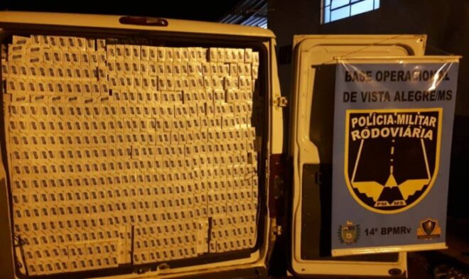 Ao verificar o interior do veiculo, foi constatado se tratar de um veiculo Fiat/ Ducato placas EYZ 4717 de Araraquara/SP, com grande quantidade de cigarros contrabandeados do Paraguai.