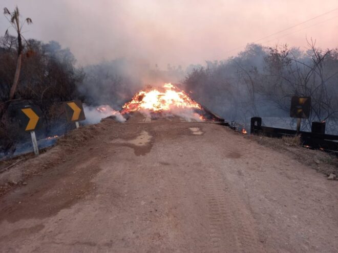 Um incêndio destruiu na tarde desta quarta-feira (18), a estrutura da ponte sobre do córrego Progresso, localizada na MS – 195 no Município de Porto Murtinho. Localizada a 30 quilômetros da área central, a ponte é de extrema importância para produtores rurais, alunos e moradores da colônia Ingazeira que utilizam a rota para chegar ao município.