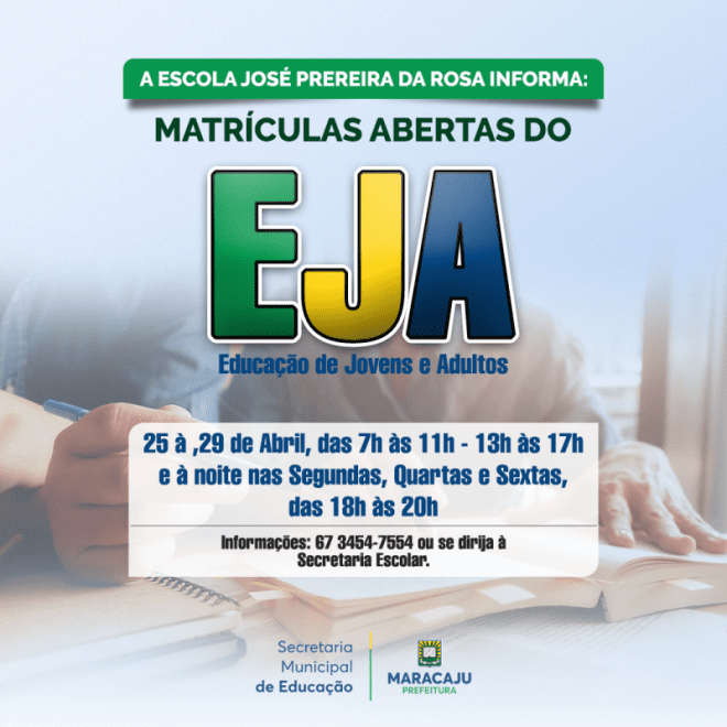 A Prefeitura de Maracaju através da Secretaria Municipal de Educação, informa que para estimular a aprendizagem, está de volta o ensino para jovens e adultos – EJA Ensino Fundamental, com inscrições abertas para pessoas a partir de 15 anos de idade.