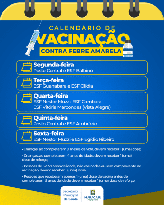 No município há um cronograma de vacinação contra a febre amarela, disponibilizado em todos os postos de saúde e que pode ser conferido a seguir: