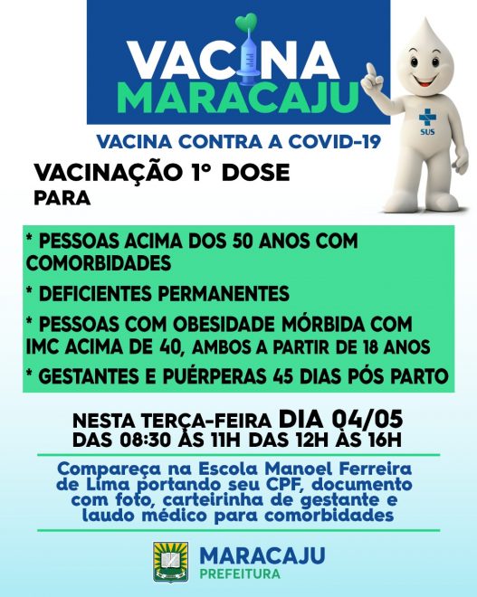 A Prefeitura de Maracaju realiza nesta terça-feira (04) um Dia “D” de vacinação contra a Covid-19. A imunização será das 08:30 às 11:00 e das 12:00 às 16:00, na Escola Manoel Ferreira de Lima. A aplicação será da primeira dose da vacina, poderão se Vacinar: