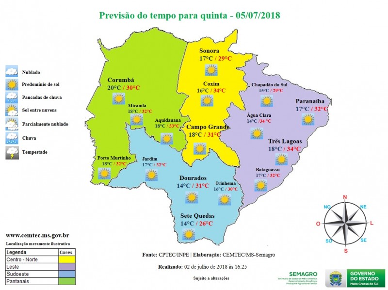 O tempo nesta quinta-feira (5.7) segue aberto em Mato Grosso do Sul sem previsão de chuva. Umidade relativa do ar pode chegar a 25%, no período da tarde, e as temperaturas oscilam de 14ºC a 33ºC.