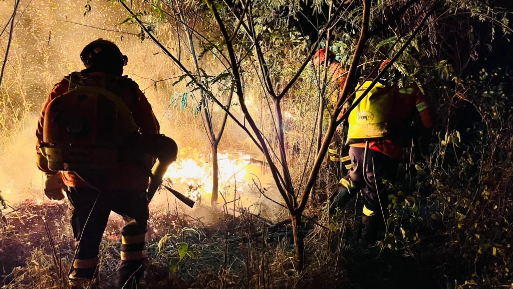 A condição climática aumenta o risco por conta das altas temperaturas com registros que chegam a 41°C, umidade relativa do ar em 10% e rajadas de vento de 50 km/h, favorecendo a propagação do fogo.
