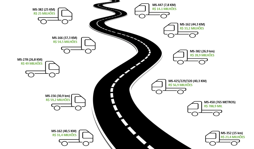 Dentro deste volume de investimento em infraestrutura, o Governo do Estado já lançou, no dia 11 de janeiro, a obra de pavimentação asfáltica de 15 quilômetros da rodovia MS-352, no município de Terenos, que vai custar R$ 23.457.847,70. A abertura das propostas vai ocorrer no dia 11 de fevereiro, conforme a Agesul (Agência Estadual de Gestão de Empreendimentos).