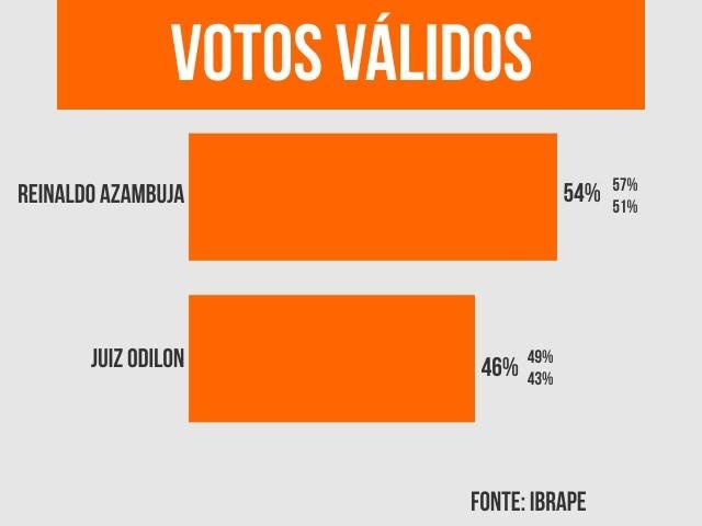 Pesquisa do Ibrape (Instituto Brasileiro de Pesquisa Opinião Pública), divulgada nesta quarta-feira (dia 24), aponta Reinaldo Azambuja (PSDB), atual governador de Mato Grosso do Sul e candidato à reeleição, com 54% dos votos válidos, enquanto seu adversário nas urnas, o juiz aposentado Odilon de Oliveira (PDT), surge com 46% das intenções.