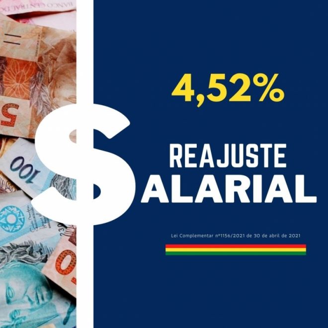 E nesta segunda feira (03/05) conforme publicação no Diário Oficial, já entra em vigor a Lei Complementar nº156/2021 de 30 de abril de 2021, que fica concedido 4,52% (quatro inteiros e cinquenta e dois centésimos pontos percentuais) de reposição inflacionária incidente sobre a remuneração dos servidores conforme alteração das Tabelas do Anexo II, Plano de Remuneração da Lei Complementar 076/2011 (Cargos de Provimento Efetivo).