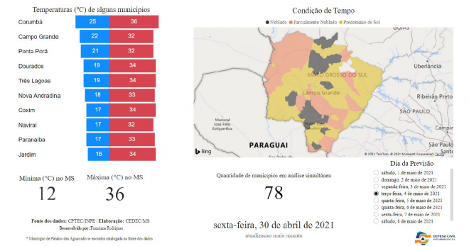 Dia com grande amplitude térmica no Estado com as temperaturas podendo registrar mínima de 12°C, estimada para municípios da região sul, e máxima de 36°C para a região pantaneira.
