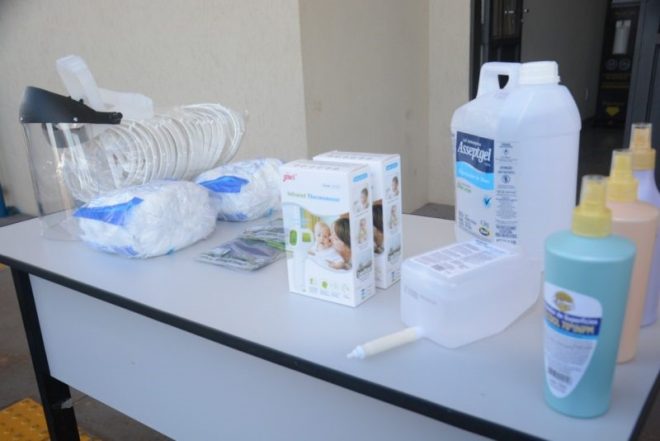 Foram entregues: 4.000 unidades de álcool (500 ml), 5.000 unidades de respirador fib. sint. pff2 sem válvula, 2.000 unidades de protetor facial plastico 8”, 92.283 unidades de máscaras descartáveis brancas e retangulares, 400 unidades de álcool em gel em galões de 5 litros, 300 dispensers de álcool gel neutro (caixa com 6 refis) e 85 aferidores de temperatura.