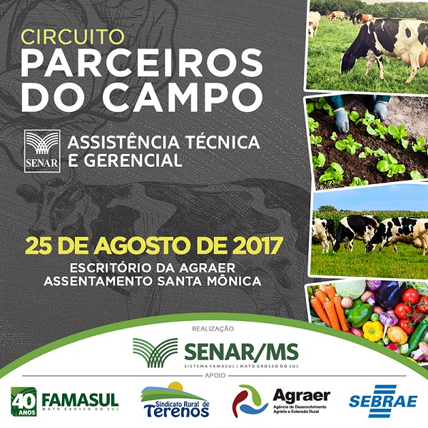 O departamento de ATeG – Assistência Técnica e Gerencial do Senar/MS – Serviço Nacional de Aprendizado Rural realiza a 3ª edição do Circuito Parceiros do Campo em Terenos. O evento acontece nesta sexta-feira (25), no escritório da Agraer – Agência de Desenvolvimento Agrário e Extensão Rural, no Assentamento Santa Monica.