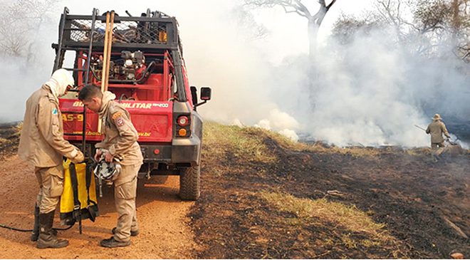 Brigadistas do Ibama e bombeiros combatem focos de calor na Fazenda Caiman, em Miranda