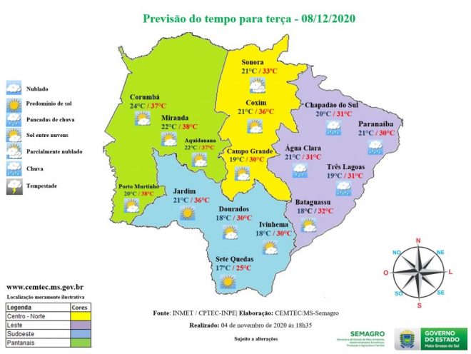 Nesta terça-feira (8) o céu fica claro a parcialmente nublado em grande parte do Estado, segundo o Centro de Monitoramento do Tempo e do Clima (Cemtec). O tempo fica mais fechado e há possibilidade de chuva no setor do bolsão.