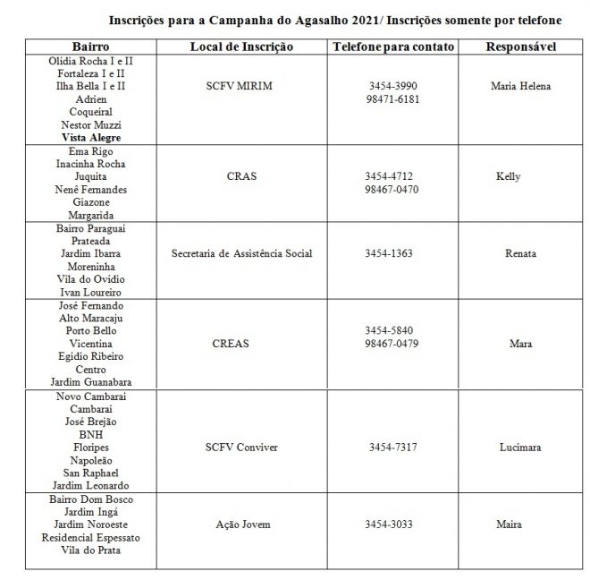 Os dias mais frios do ano se aproximam e é hora de aquecer as pessoas que mais precisam neste momento. Para proteger as famílias mais carentes do município a Prefeitura de Maracaju segue com as inscrições abertas para quem deseja receber doações da Campanha do Agasalho de 2021. As inscrições seguem até dia 14/05 e devem ser feitas por telefone nos locais indicados.