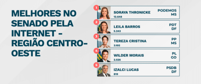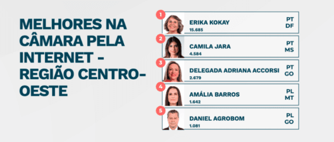 Na premiação regional, Camila Jara ficou em segundo lugar, superada apenas pela deputada Erika Kokay (PT/DF). Por outro lado, a senadora Soraya obteve destaque máximo, ficando em primeiro lugar, seguida por Tereza Cristina (PP), que conquistou a terceira posição.