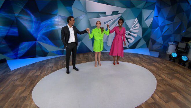 Os apresentadores, então, revelaram quem ficará no lugar dele no Fantástico: Maju Coutinho. Ela entrou no palco e cumprimentou sua nova dupla, Poliana.