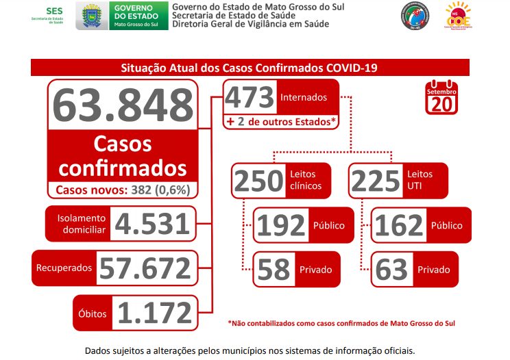 Os municípios que apresentaram os maiores índices de novos casos são: Campo Grande +109; Corumbá + 54; Dourados +49, Três Lagoas + 30 e Aquidauana +30. A média móvel de positivos para a doença é 681/dia.