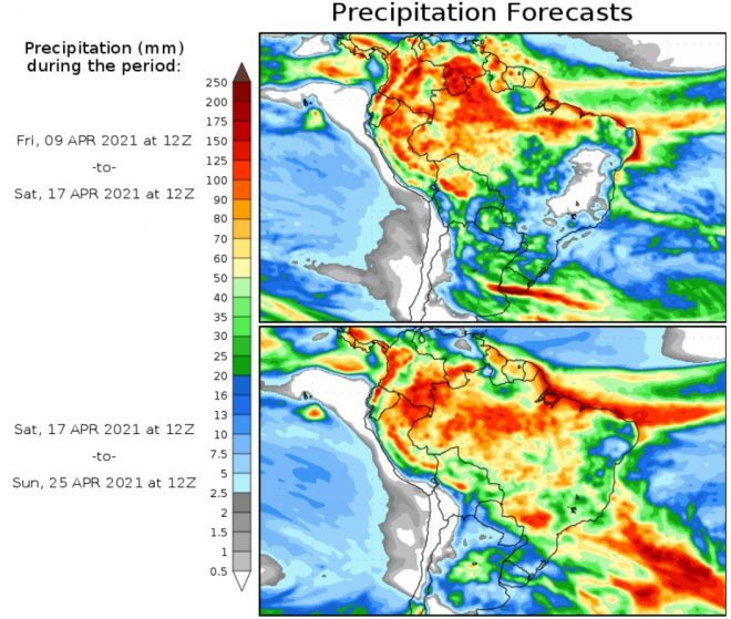 Pelo menos até 17 de abril o prognóstico do Cemtec indica que será um período com ligeira redução das áreas de instabilidades, ou seja, pouca chance de chuva. São esperadas pancadas isoladas de no máximo 20 milímetros para grande parte do Estado. As poucas chuvas devem ocorrer a partir de 16 de abril. A partir daí as chuvas devem retornar ao Estado com maiores acumulados. A estimativa é de que chova entre 50 a 80 milímetros no período entre 17 e 24 de abril. As precipitações devem se concentrar nas regiões produtoras.