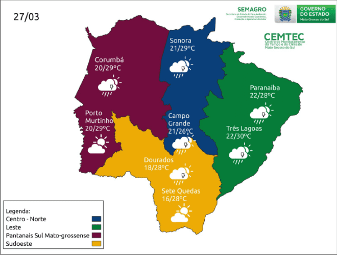 Confira no mapa as condições de tempo e temperatura estimados para Campo Grande e alguns municípios do Estado neste domingo.