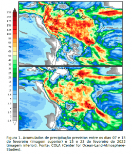 Já para o período de 15 a 23 de fevereiro, o Cemtec aponta para a probabilidade de chuvas de intensidade moderada a forte e tempestades acompanhadas de raios, rajadas de vento e eventual queda de granizo com acumulados de chuva entre 5 – 150 mm, com destaque para as regiões sudoeste e leste.