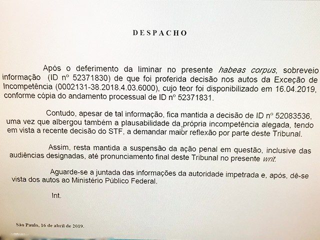 Conforme apurado pela reportagem, a Justiça Federal tentou manter as audiências, informando no mesmo dia 16 de abril que houve decisão nos autos de exceção de incompetência. Mas a liminar para suspender o processo foi mantida.