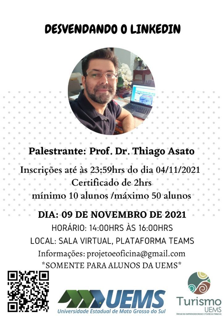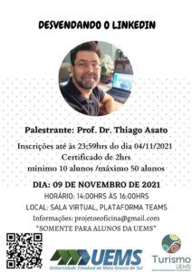 Ministrada pelo Prof. Dr. Thiago Asato, a oficina acontece no dia 09 de novembro, das 14h às 16h, em sala de aula virtual pela plataforma Microsoft Teams, com 50 vagas disponíveis.
