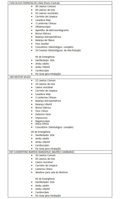 Foram entregues carrinho de limpeza, lixeiras, maca clínica, material de escritório e também um “Kit Emergencial – para paradas cardiorrespiratórias” com desfibriladores cardíacos, ambu’s adulto, infantil e neonatal, dentre outros. Estes equipamentos serão usados para atender pacientes com intercorrências graves que requeiram um suporte de estabilização até a transferência para uma unidade hospitalar.