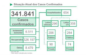 Dos 7.165 casos ativos no Estado, 654 são casos de internação, sendo 296 em leitos clínicos e 358 em leitos de UTI. A ocupação de leitos UTI SUS por macrorregião de internação é de 81% na macrorregião de Campo Grande, 65% na de Dourados, 69% na de Três Lagoas e 56% na de Corumbá.