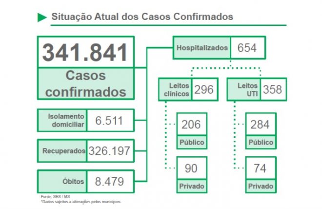 Dos 7.165 casos ativos no Estado, 654 são casos de internação, sendo 296 em leitos clínicos e 358 em leitos de UTI. A ocupação de leitos UTI SUS por macrorregião de internação é de 81% na macrorregião de Campo Grande, 65% na de Dourados, 69% na de Três Lagoas e 56% na de Corumbá.