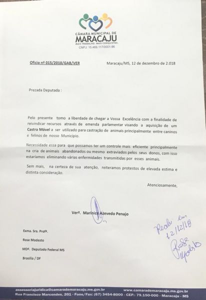 Dentre os pedidos estão a viabilidade de recursos para um “Castra Móvel” a ser utilizado para castração, principalmente de cães e gatos, mantendo assim um controle mais eficiente com relação a abandonos e e controle de doenças.