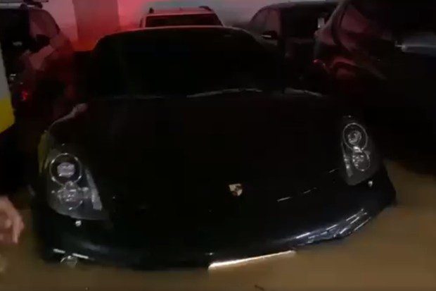 Em vídeos e fotos que circulam nas redes sociais é possível ver um Lamborghini Huracán 2015 com metade de sua carroceria submersa pelas águas.