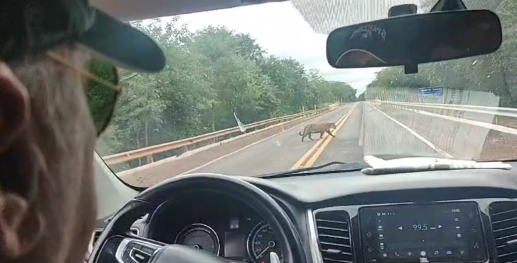 Em um momento raro e impressionante, uma onça-pintada foi flagrada atravessando a BR-262 no sentido Miranda-Corumbá, a cerca de 10 km da ponte sobre o Rio Paraguai. As imagens, capturadas pelo motorista César Marques, mostram o majestoso felino correndo em direção ao mato após cruzar a rodovia.